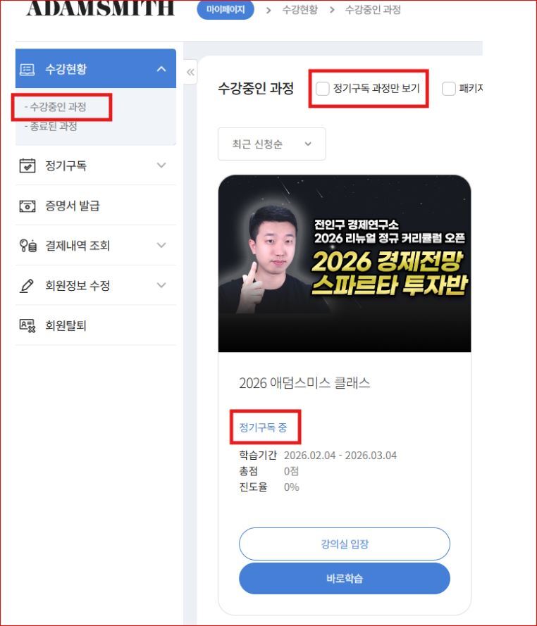 수강신청이 완료되면 수강현황 > 수강중인 과정에서 정기구독으로 수강하고 있는 과정을 확인하실 수 있습니다.