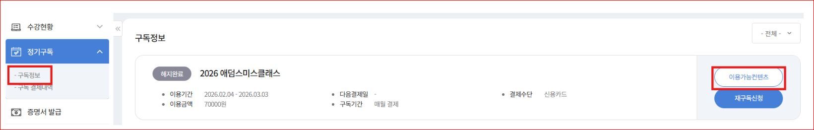 정기구독 > 구독정보 > 결제한 구독정보의 [이용가능컨텐츠] 버튼 클릭하셔서